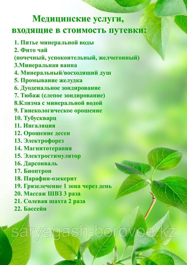 Перечень процедур: Медицинские услуги, входящие в стоимость путевки Бальнеотерапия Гидротерапия Питье минеральной воды Минеральная ванна Циркулярный душ Восходящий душ Промывание желудка Дуоденальное зондирование Слепое зондирование(тюбаж) Десневое орошение Лечебные микроклизмы(отвары трав, «Кызыл-май») Гинекологическое орошение. Физиотерапия Парофино-озекретивное лечение Ингаляция с травами и маслами УФО терапия СМТ терапия УВЧ терапия УЗТ Оксигенотерапия Электрофорез Магнитотерапия